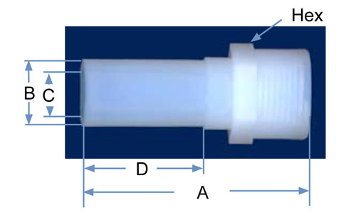 | PFA Part No. | Pipe Size | FNPT | Orifice | A | B | C | D | Hex |